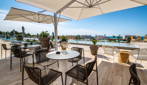 Verbringen Sie eine wundervolle Zeit bei einem kühlen Getränk oder einem köstlichen Snack auf unserer spektakulären Dachterrasse mit spektakulärem Blick auf die Adria. Unsere lebhafte Poolbar ist den ganzen Tag über geöffnet und bietet spezielle Cocktails, Spritz, frische Sandwiches und Eis.