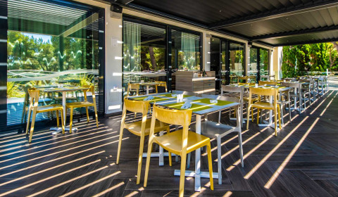 Das neue Design umfasst raumhohe Fenster und eine großzügige Terrasse mit Panoramablick auf die Adria. Genießen Sie eine große Auswahl an lokalen und internationalen Gerichten nur einen Steinwurf vom Strand entfernt.